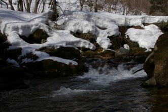 / 川,河畔植生,植物,岩石,雪,水しぶき,木,森林