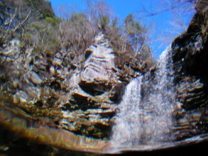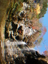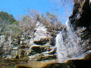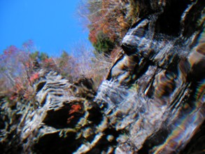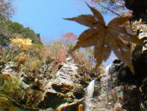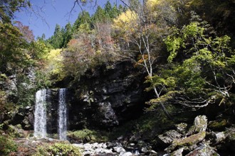 / 川,滝,岩石,河畔植生,植物,青空,紅葉,木,森林
