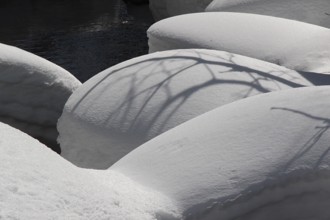 / 川,岩石,雪,植物,影,河畔植生,足跡,動物