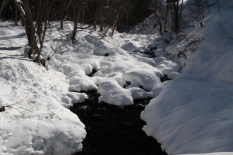 / 川,岩石,植物,河畔植生,雪,足跡,動物,木,森林