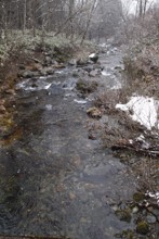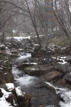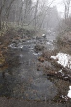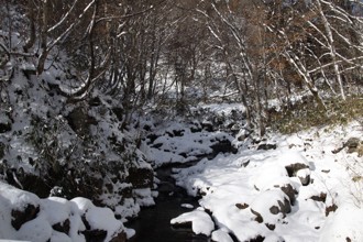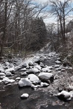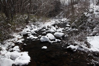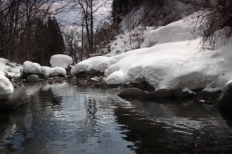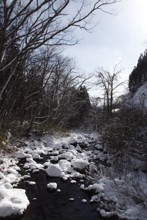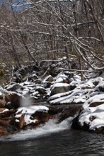 / 川,岩石,雪,氷,水しぶき,河畔植生,植物,木,森林