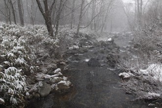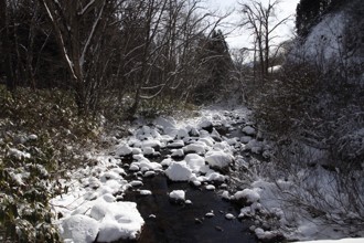 / 川,岩石,雪,氷,植物,河畔植生,つらら,ササ,タケ,竹,コケ