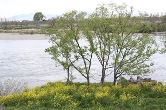 / 川,植物,河畔植生,建物,山,花,菜の花,消波ブロック,車