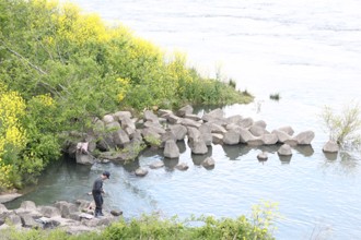 / 川,植物,河畔植生,花,菜の花,消波ブロック,岩石,帽子,長靴,ペットボトル