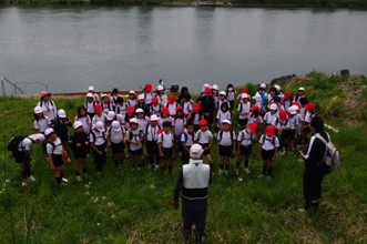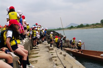 / 川,植物,子供,体操着,体育着,赤白帽,帽子,水筒,鞄,船,エンジン,靴,カメラ,救命胴衣,人