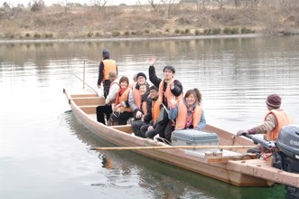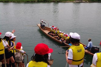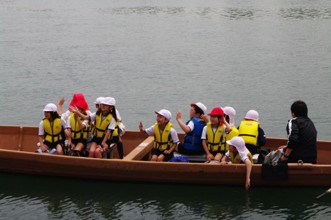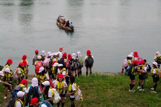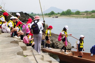 / 川,船,救命胴衣,人,子供,眼鏡,帽子,赤白帽,鞄,笑顔