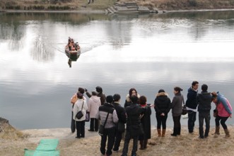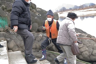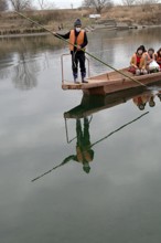 / 川,船,エンジン,箱,人,笑顔,救命胴衣,帽子,眼鏡,腕時計,鞄,河原,植物,木,河畔植生