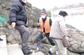 / 川,人,鞄,眼鏡,靴,救命胴衣,帽子,マスク,船,階段,河原,植物,河畔植生,手袋