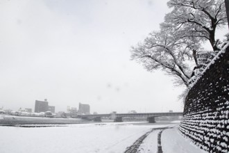 / 船,雪,木,植物,河畔植生,川,建物,橋,轍,街灯