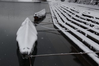 / 船,雪,木,植物,河畔植生,川,建物