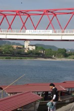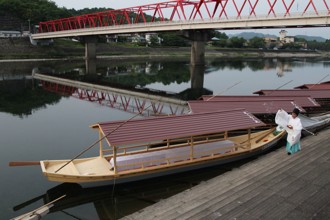 / 川,船,橋,河原,植物,河畔植生,堤防,植物,木,建物,山,空,人,和服
