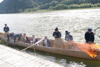 / 川,人,和服,鵜匠,かがり火,眼鏡,数珠,植物,木,河畔植生,建物,船,山,空