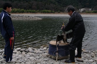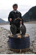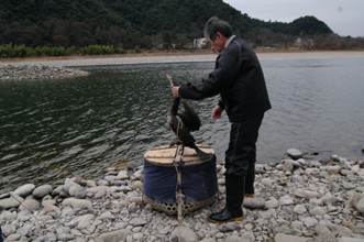 / 川,河原,岩石,カゴ,鳥,鵜,ウ,人,山,木,植物,空,紐,輪ゴム