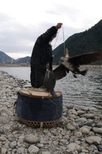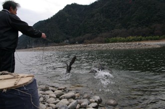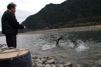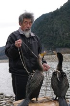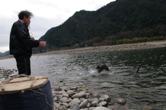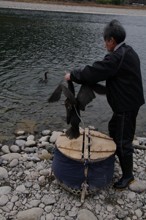 / 川,河原,岩石,人,鳥,ウ,鵜,紐,カゴ,植物,山,建物,木,空,しぶき