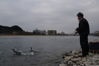 / 川,河原,岩石,カゴ,鳥,鵜,ウ,人,山,木,植物,空,橋,建物,紐,輪ゴム
