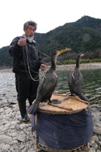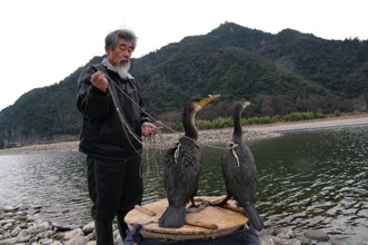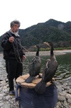 / 川,河原,岩石,カゴ,鳥,鵜,ウ,人,山,木,植物,空,紐,輪ゴム