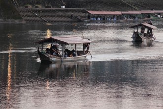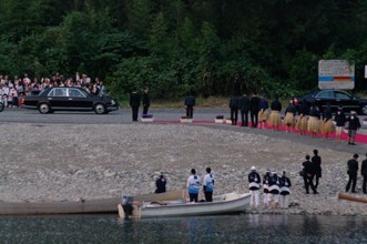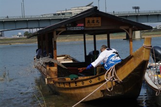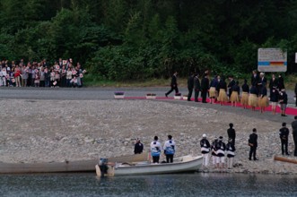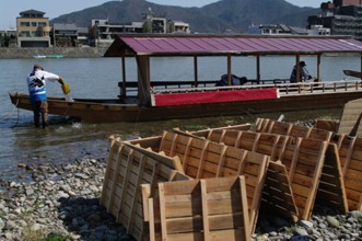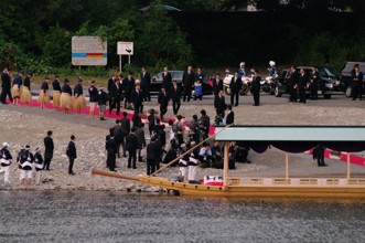 / 川,河原,道路,船,エンジン,人,法被,帽子,はちまき,鵜匠,レッドカーペット,日本国旗,カメラ,子供,プランター,植物,花,竹