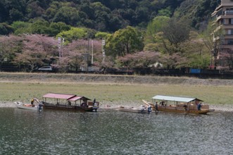 / 川,船,人,植物,ロープ,法被,手袋,エンジン,堤防,植物,さくら,桜,花,木,建物,橋,自転車,外灯,山