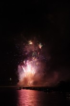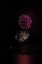 / 川,花火,船,明かり,建物,煙