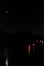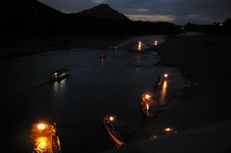 / 川,河原,船,かがり火,水面,月