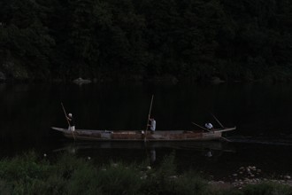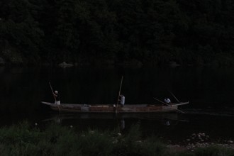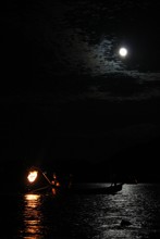 / 川,鵜飼い,漁,かがり火,鵜匠,空,月,雲,人,水面