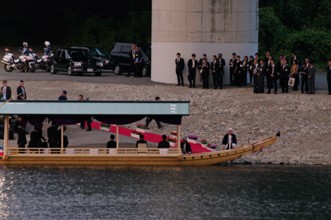 / 川,河原,船,人,法被,はちまき,レッドカーペット,プランター,植物,花,車,バイク,警察,ヘルメット,紙袋,腕章,岩石