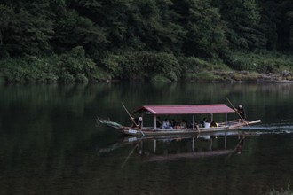 / 川,河原,道路,船,人,法被,帽子,はちまき,鵜匠,レッドカーペット,プランター,植物,花,竹,エンジン,カメラ,三脚,車,バイク,警察,ヘルメット,紙袋