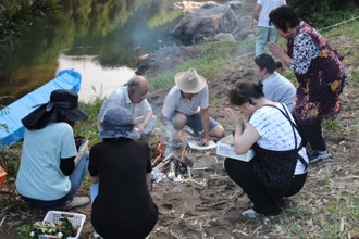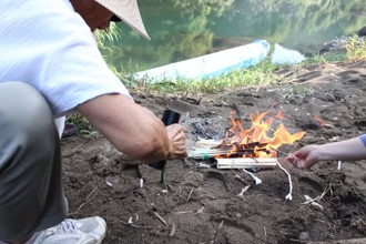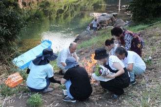 / 人,火,線香,帽子,眼鏡,花,川,植物,河畔植生,岩石