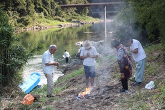 / 人,火,線香,帽子,眼鏡,川,植物,河畔植生,岩石,橋