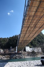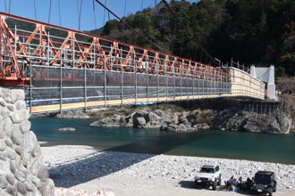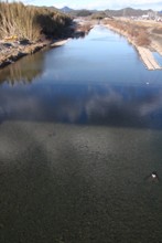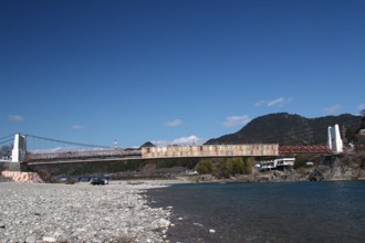 / 空,雲,山,橋,建物,川,河原,岩石,車
