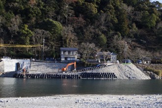 / 山,建物,重機,電柱,電線,川,河原,岩石