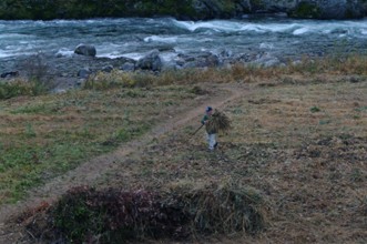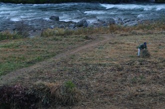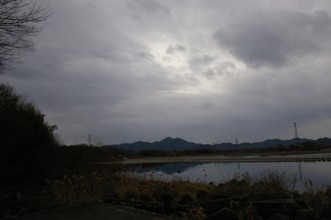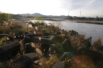 / 空,雲,鉄塔,電線,山,建物,川,河原,岩石,ブロック,ススキ,河畔植生,植物