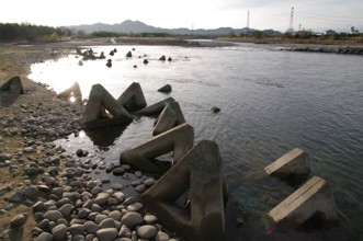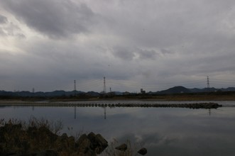 / 空,雲,鉄塔,電線,山,川,河原,岩石,ブロック,河畔植生,植物