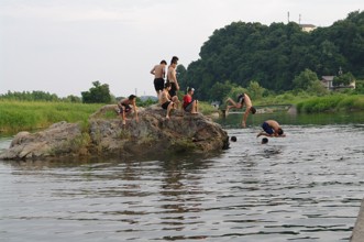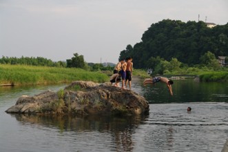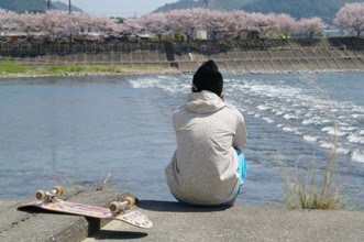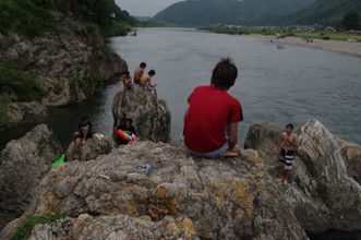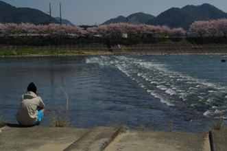 / 空,山,桜,木,人,川,河原,岩石,電柱,電線