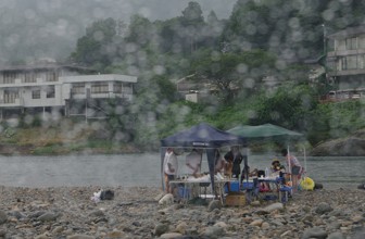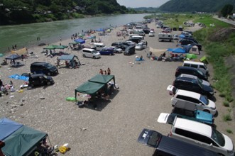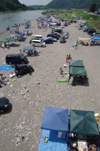 / 山,川,河原,岩石,人,テント,建物,電柱