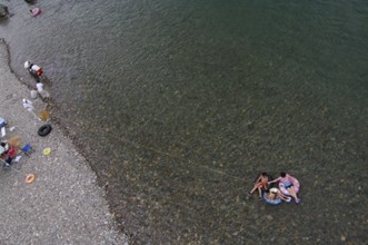/ 川,河原,人,子供,船,車