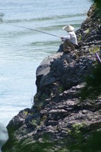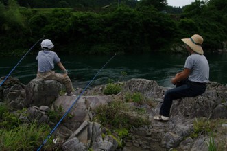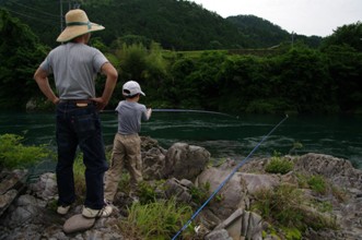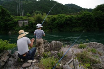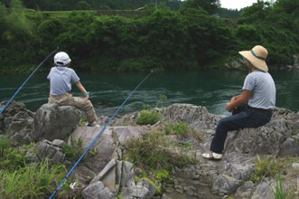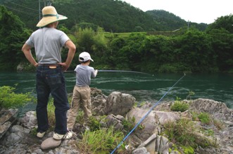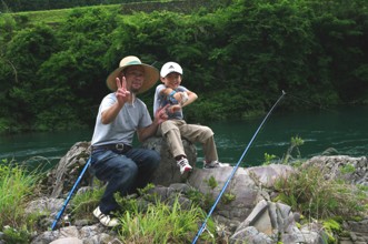 / 山,川,人,子供,帽子,釣り,岩石,河畔植生