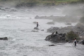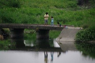 / 山,川,人,子供,帽子,釣り,岩石,河畔植生,電柱,電線
