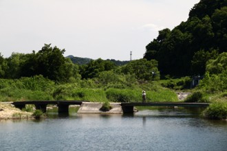 / 空,雲,山,橋,人,笠,川,河畔植生