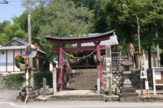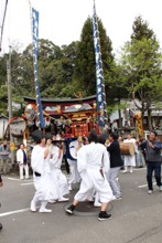 / 神社,祭り,神輿,人,着物,木,道路,建物