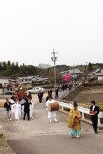 / 祭り,神輿,人,着物,道路,建物,電柱,電線,街並み,畑,山