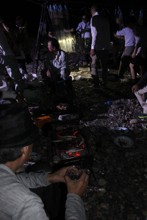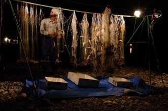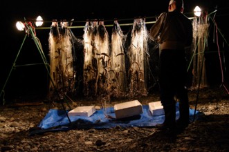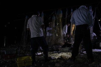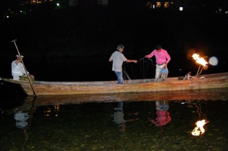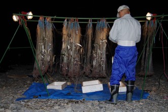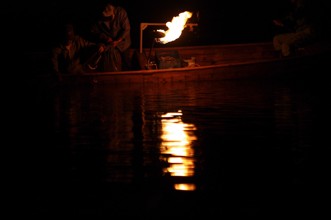 / 人,漁,網,魚,船,川,火