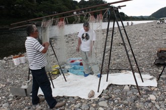 / 人,漁,網,川,岩石,河畔植生,車
