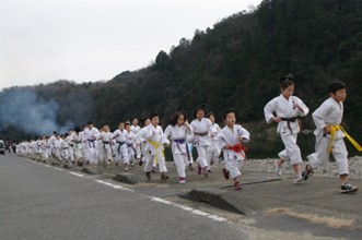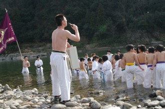 / 人,子供,着物,武道,川,河原,岩石,河畔植生,マイク,旗