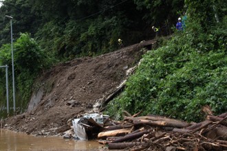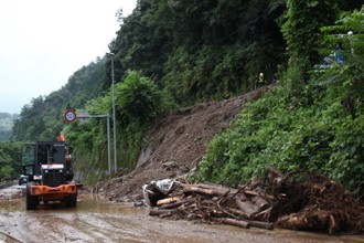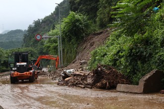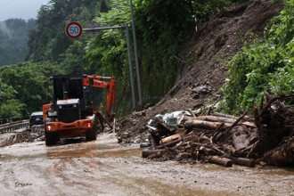 / 山,植物,人,重機,標識,車,土砂崩れ