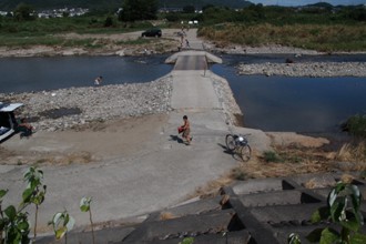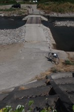 / 人,川,車,自転車,植物,河畔植生,岩石,ヘルメット,山,空,建物,鉄塔,子供,網