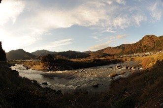 / 山,川,空,橋,岩石,植物,河畔植生,建物,鉄塔