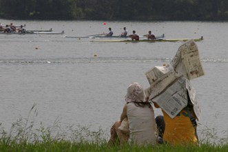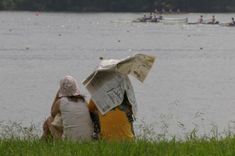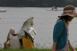 / 人,川,新聞紙,船,植物,帽子,河畔植生