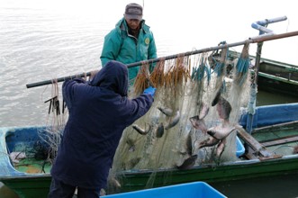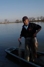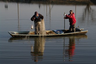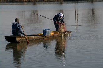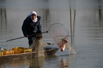 / 人,船,川,魚,網,植物,河畔植生,帽子