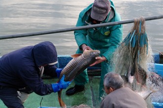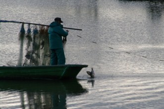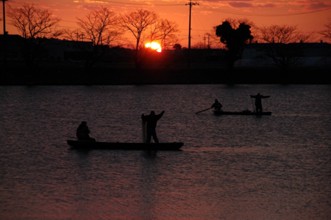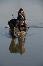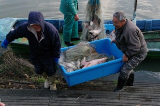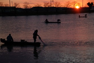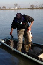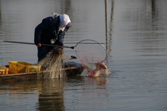/ 人,船,川,帽子,網,魚